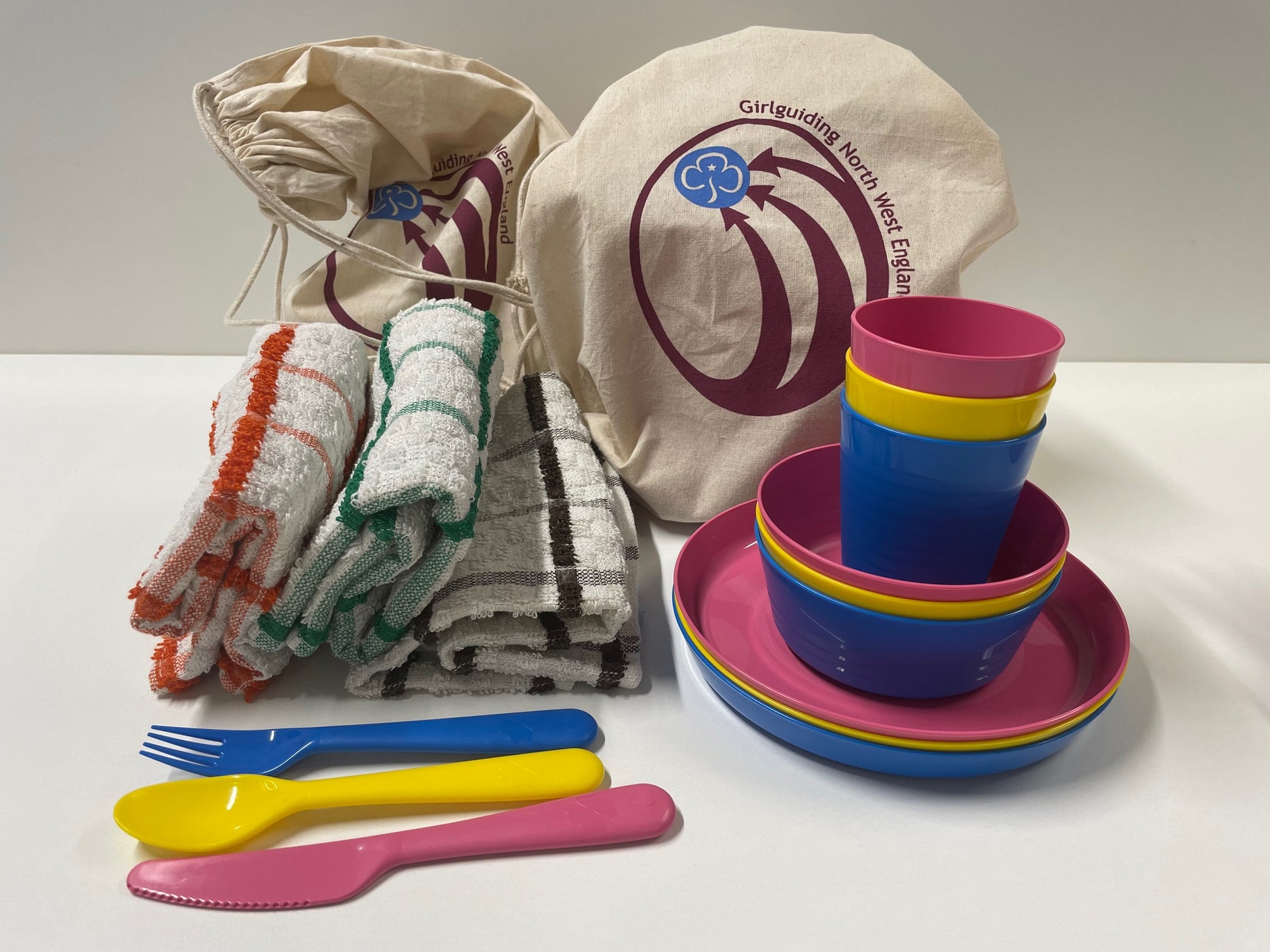 Contains: One child-sized plate, bowl, cup, and cutlery set and one tea towel in a cotton drawstring bag with the Girlguiding North West England region logo printed on. Bags can be customised with fabric pens!