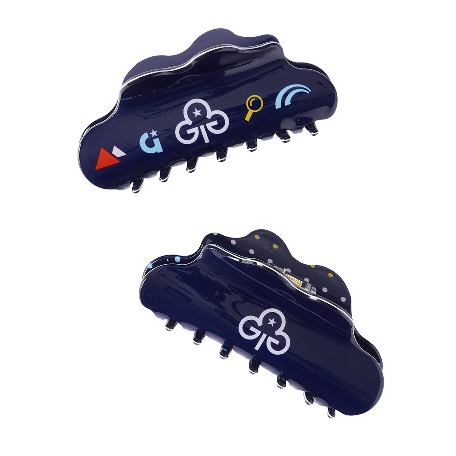 2 pack of navy blue claw clips, one featuring Girlguiding icons, and the other the trefoil and brand coloured spots. Great for all sections.