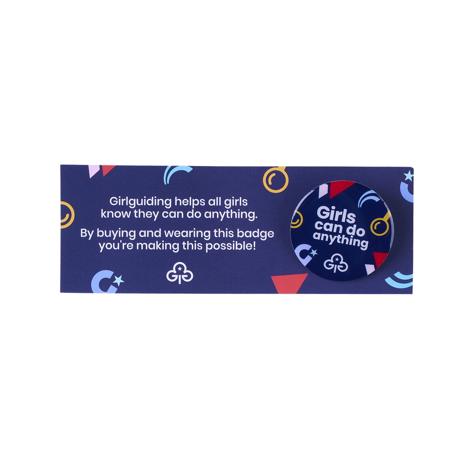 A trendy pin badge with backing that represents our mission to help girls achieve their potential. We help all girls know they can do anything!