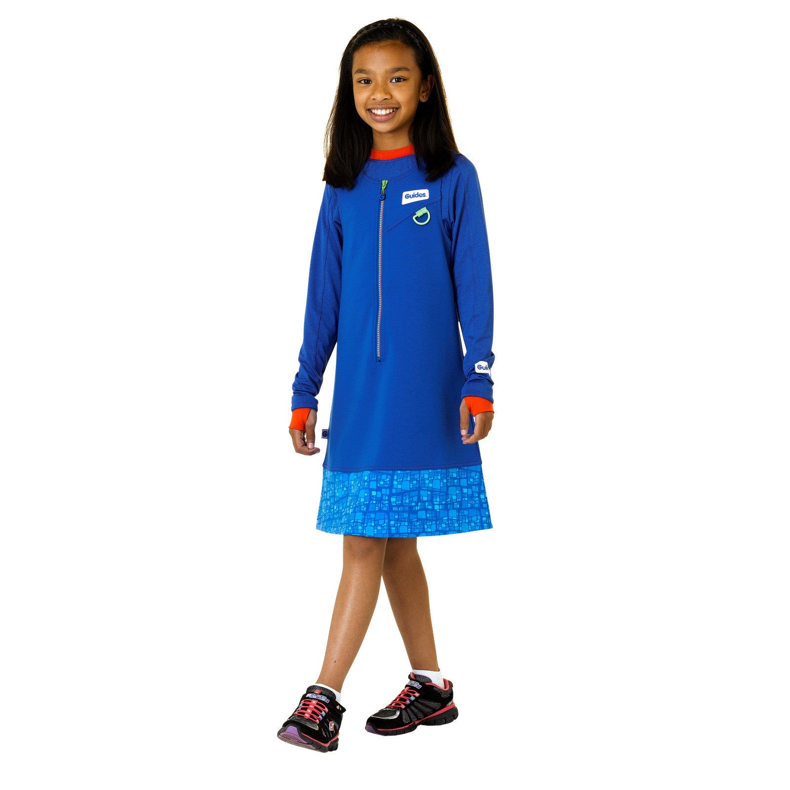 Part of the Guide mix and match uniform range, this dress is ideal for formal occasions and should be worn with an item of clothing underneath. This can be the Guide polo shirt, long-sleeved top or an item of clothing of your choice in navy or black. Designed in the Guides section colours it features a two tone zip and a bright tile print.