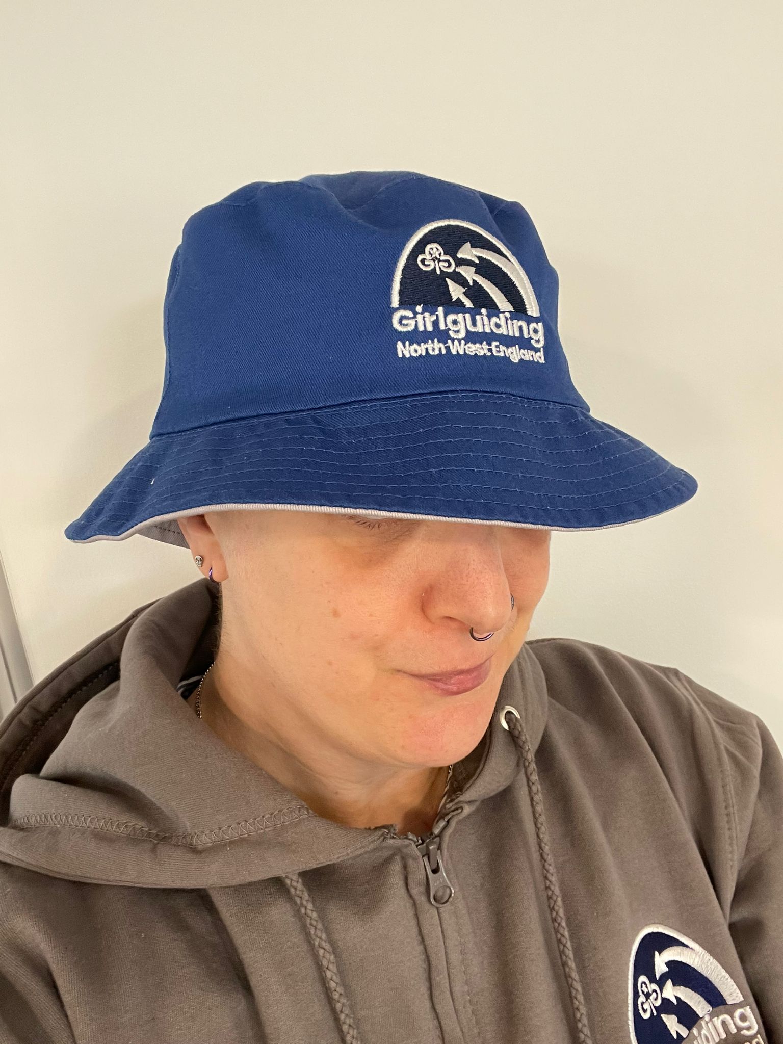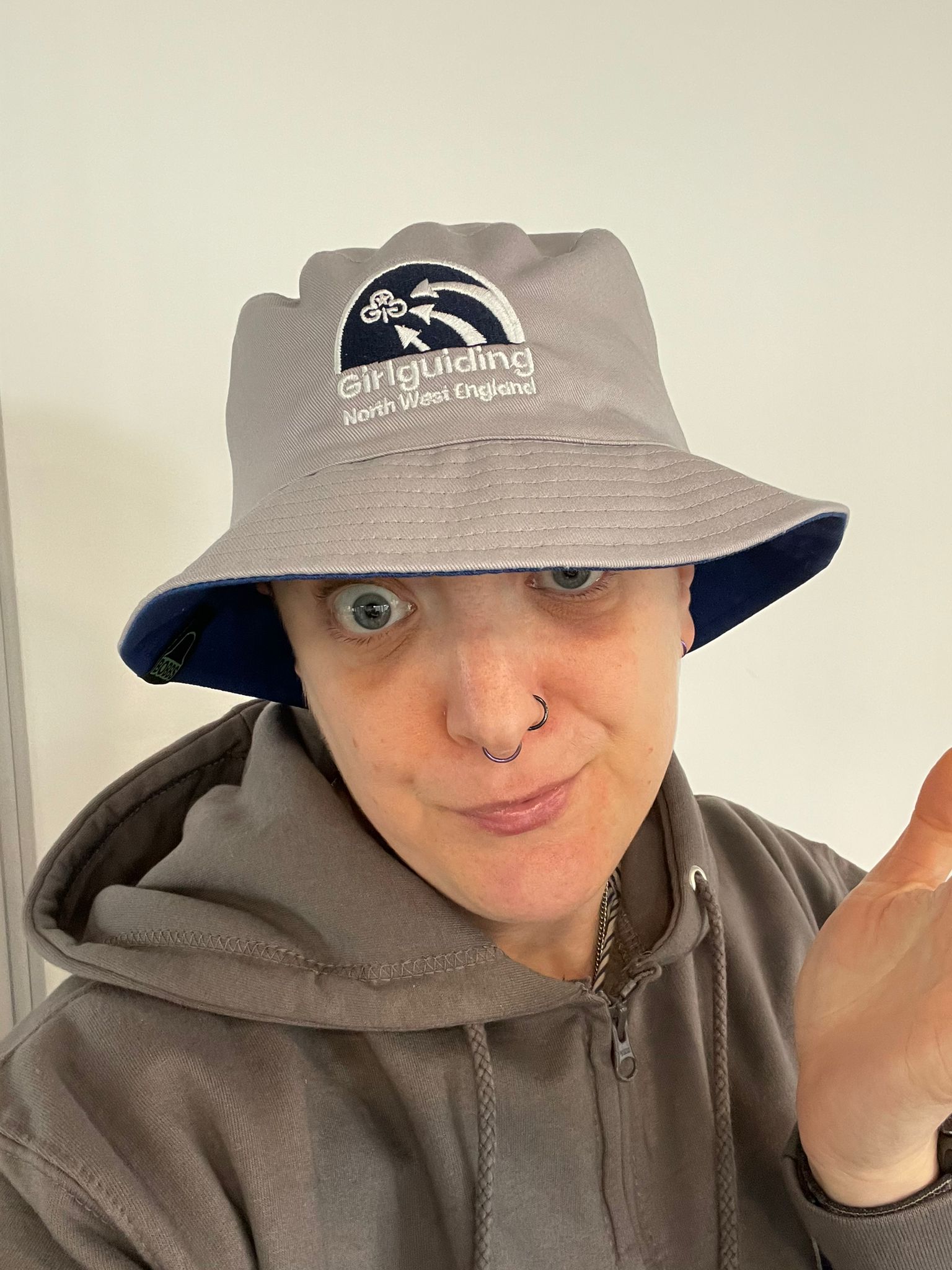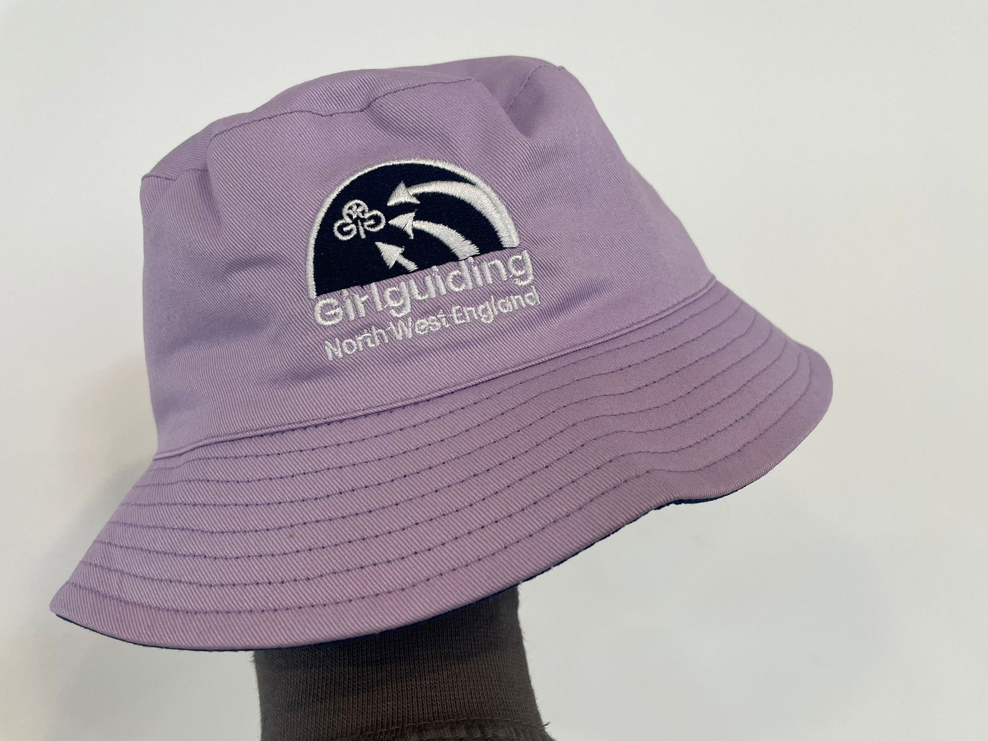 Either a cool grey or a light lilac, both can be reversed to a fun blue! Made from cotton and embroidered with our region logo.