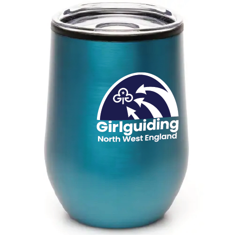 Our region logo on a shiny turquoise travel mug, for use on the go or around the camp fire.